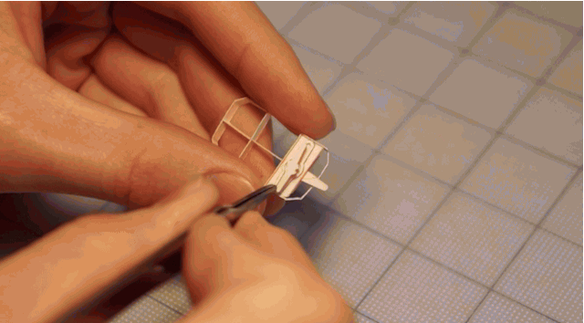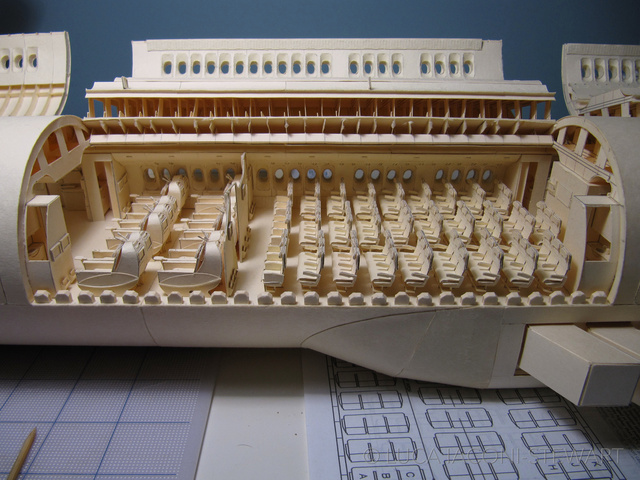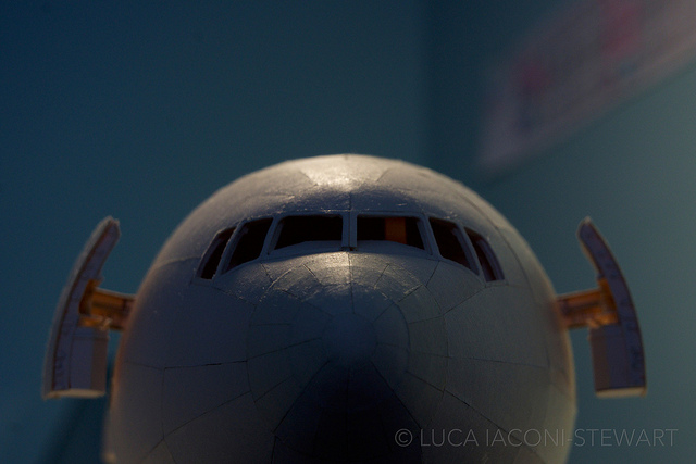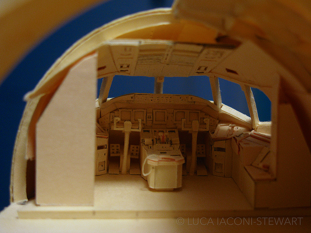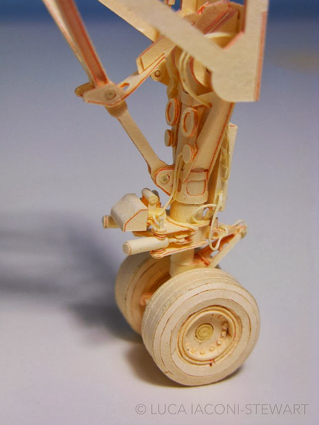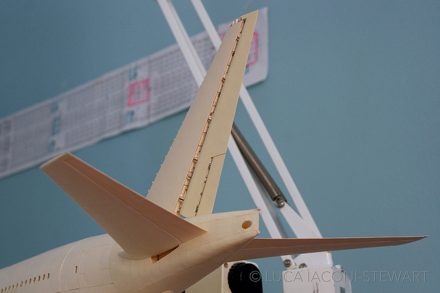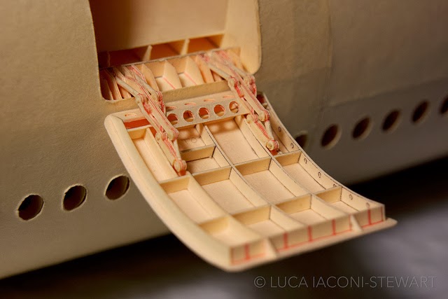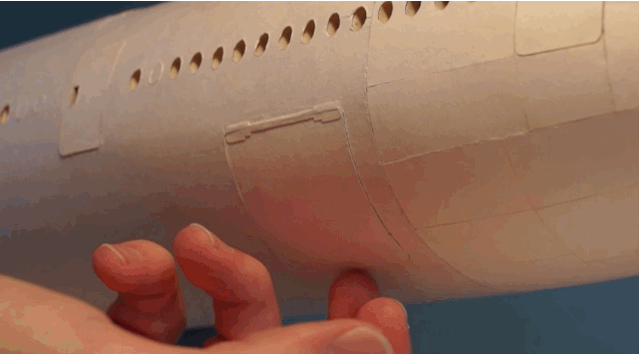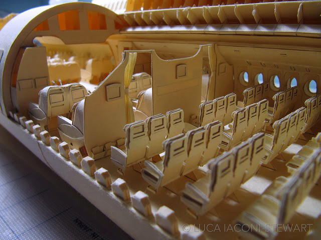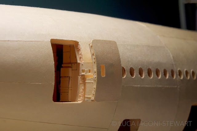 Seu boeing, que obedece a escala 1:60, possui incríveis componentes articulados, como dobradiças e outros sistemas – também feitos em papel. Em seus últimos vídeos, Luca mostra detalhes do processo de pintura do aeromodelo, o que provavelmente é a última etapa do trabalho.