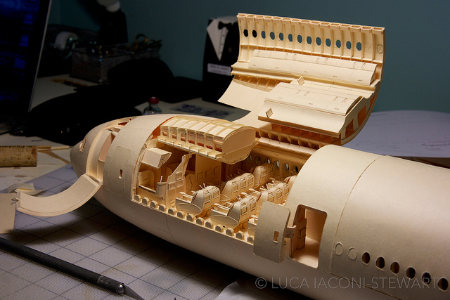 Em São Francisco, Califórnia (EUA), um cara chamado Luca Iaconi-Stewart está construindo uma impressionante réplica de um boeing (Air India 777-300ER), utilizando apenas papel e cola.