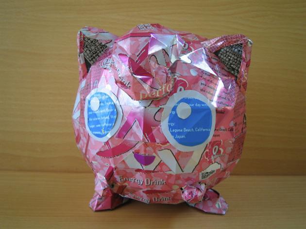 Muito criativo. E não tem pintura não, creio que o Pokémon Gengar foi feito utilizando a parte interna das latinhas.
