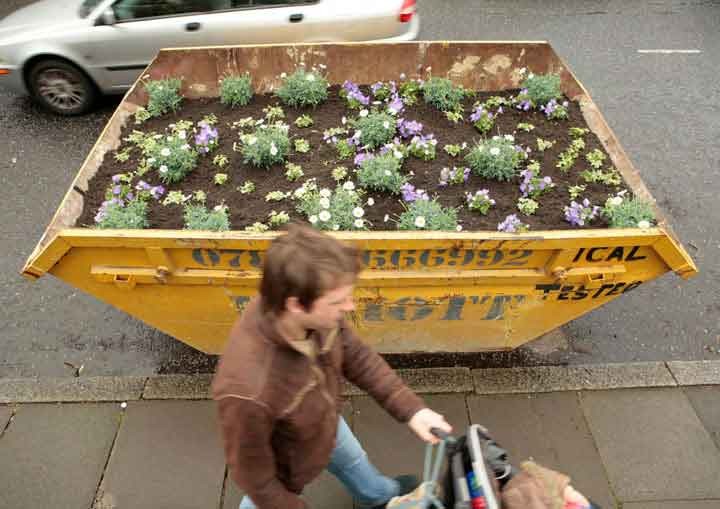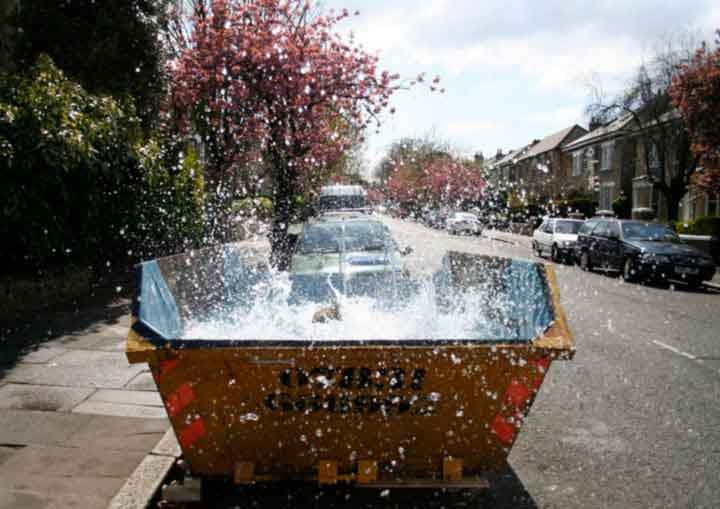 Uma cena como essa ocorreu quando as caçambas se tornaram objeto de trabalho do artista Oliver Bishop-Young – Reino Unido. Em seu projeto intitulado “Skip Conversions”, ele promoveu uma série de novos usos para o que antes servia apenas como depósito de lixo.