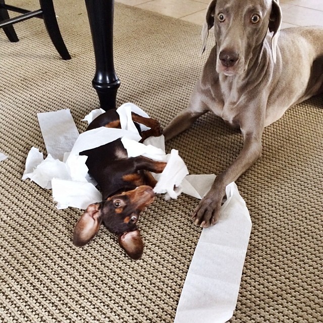 Ao que parece são inseparáveis, sendo Sage um filhotinho (nas últimas fotos ele já está maior) e o Harlow o maioral da raça Weimaraner, muito brincalhão. O curioso é como são feitas as fotografias, realmente um mistério, pois os grandes astros parecem estar muito a vontade, seja no sofá ou em outras poses que não parecem tão simples de se reproduzir com animais de estimação.