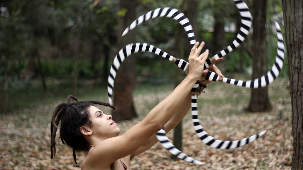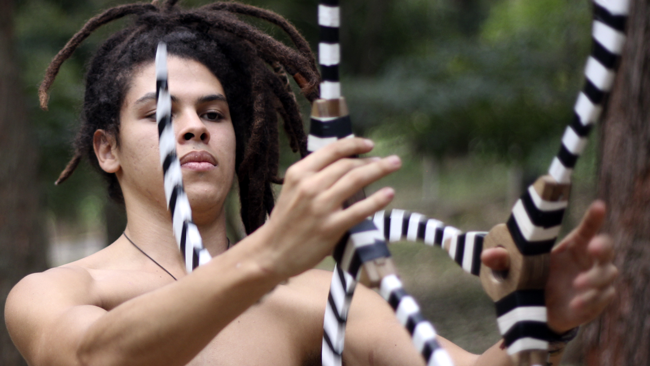 Um cara ajeita os dreads do cabelo enquanto uma espécie de violino toca ao fundo. Ele está em um cenário arborizado e veste apenas uma calça saruel. Ainda nos primeiros 10 segundos de vídeo, apanha no chão dois objetos em formato de “S” e inicia sua mágica.