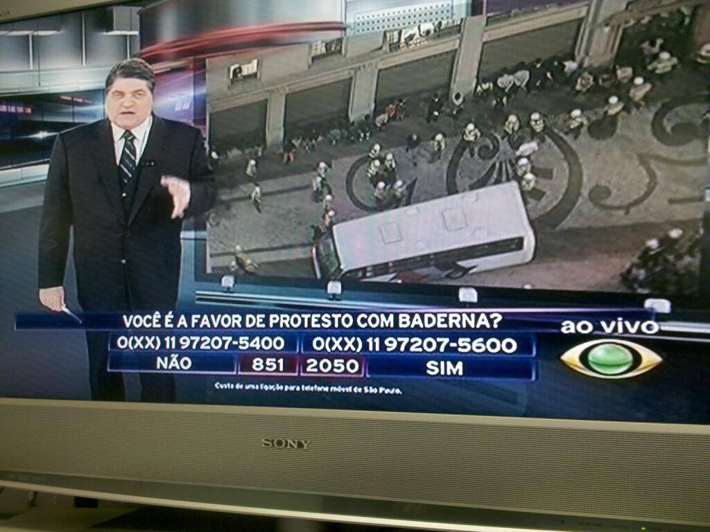 Crente de que, mais uma vez, conseguiria ditar a “resposta correta”, Datena lança a enquete para a sua audiência: “Você é a favor desse tipo de protesto?” – referindo-se a protestos com “vandalismo”. Ele ficou tão espantado com a resposta (sim) que decidiu reformular a pergunta: “Você é a favor de protesto com baderna?”. Nada mudou no resultado! Restou a ele improvisar algum tipo de justificativa antes de tirar a pesquisa do ar!