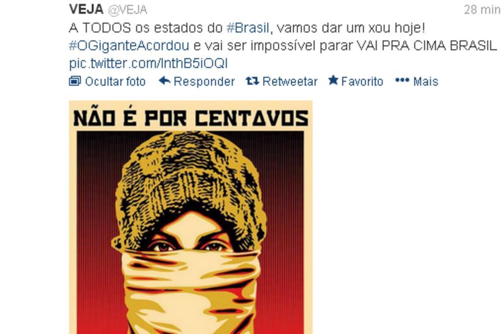 O twitter da Revista Veja, tradicional veículo de comunicação conservador, foi invadido e passou a postar mensagens favoráveis aos protestos que viriam a ocorrer na segunda-feira, 17/06/2013.