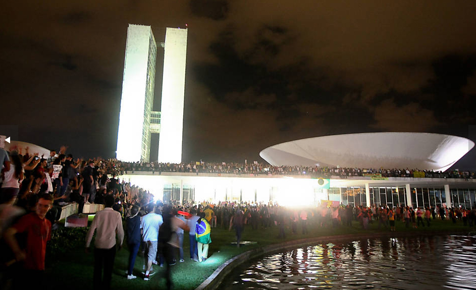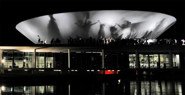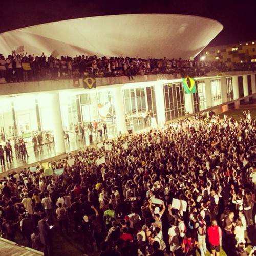 Manifestantes furam o bloqueio policial e sobem no prédio do congresso, em Brasília (17/06/2013). Só fico triste pelo fato do Niemeyer ter morrido antes de ver isso, afinal de contas, se ele colocou uma rampa no projeto é porque queria que as pessoas ocupassem aquele espaço!