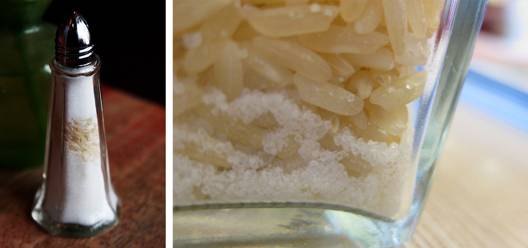 Arroz no saleiro é tradição. Qual boteco de esquina não usa colocar arroz junto ao sal para facilitar a saída deste maravilhoso pó branco pelos micro orifícios que os saleiros costumam ter? O arroz absorve a umidade deixando o sal mais “fino”, ou soltinho, como muita gente costuma dizer. Tome cuidado para os grãos não embolorarem.