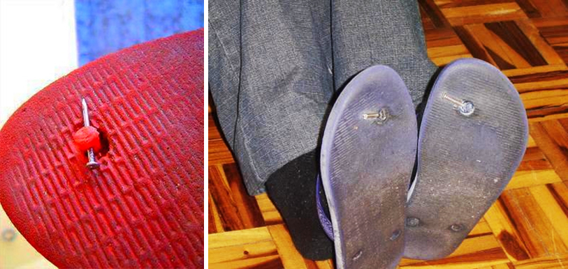 Quando a tira das Havaianas do gambiarreiro quebra ele não tem dúvidas, procura um prego, ou alfinete ou algo parecido para empreender um brilhante conserto. Geralmente a borrachinha que prende as tiras por baixo da sola se solta e a gambiarra resolve o problema. Soube de gente que usou chinelos assim por mais de um ano!