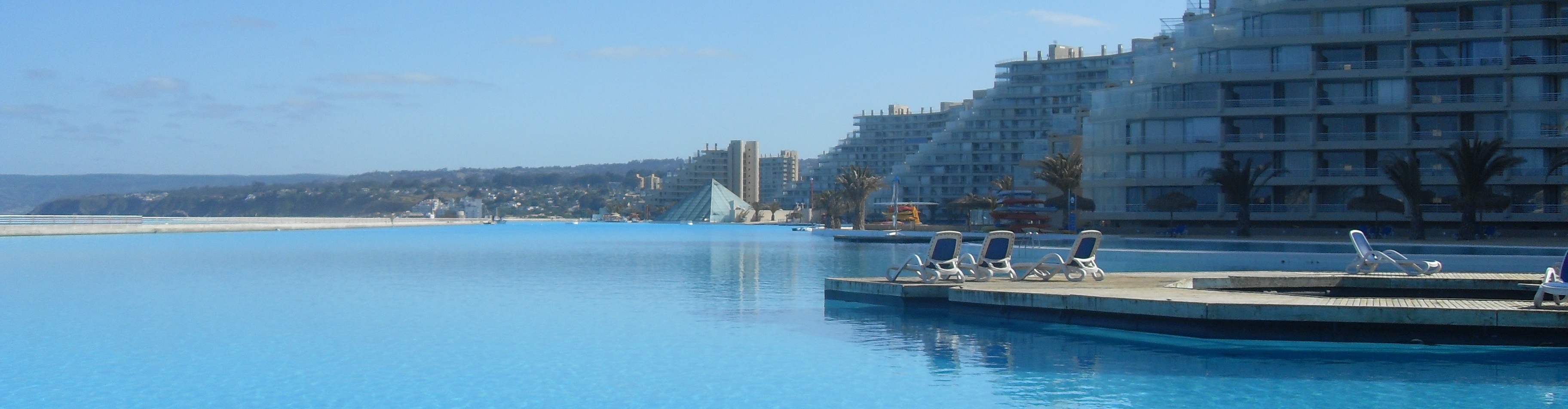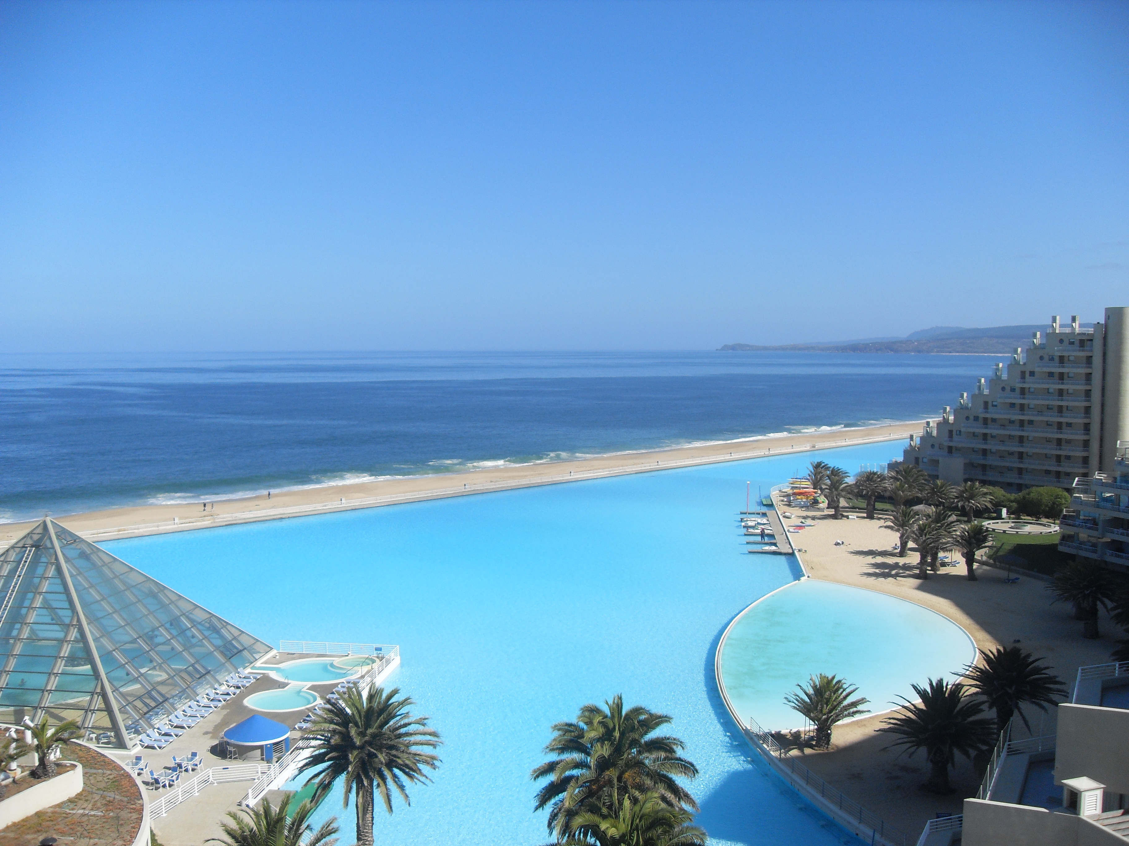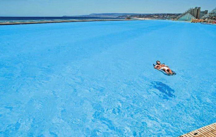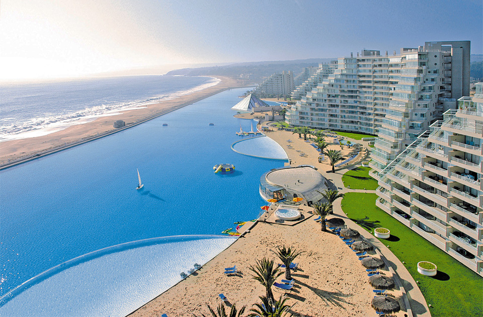 Com 1km de extensão e superfície de 80 mil m², a piscina gigante localizada no resort San Alfonso Del Mar é reconhecida como a maior do mundo pelo Guinness, o livro dos recordes. Os 250 mil m³ de água contidos nela seriam suficientes para abastecer 6 mil piscinas de dimensões convencionais.
