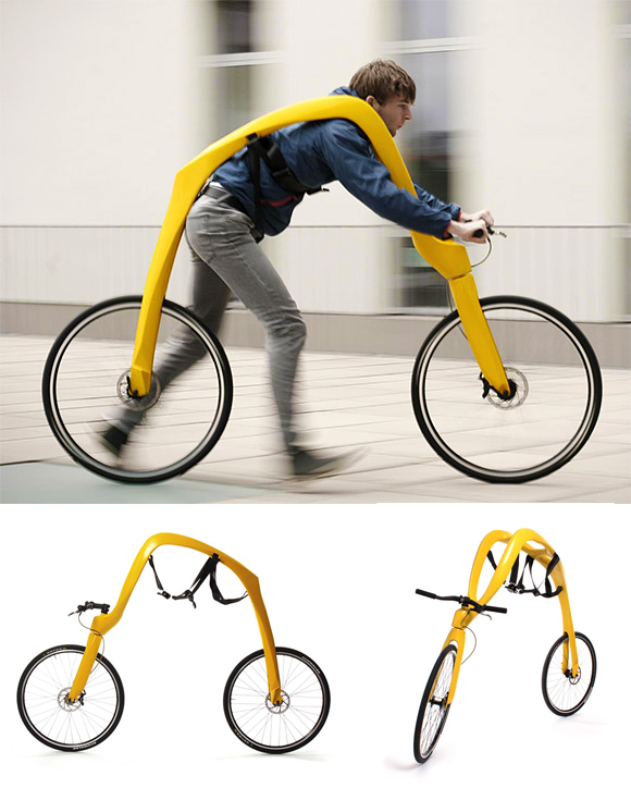 “Fliz Bike” é o nome deste protótipo de bicicleta alemão criado com a intensão de incentivar o uso da bicicleta como alternativa viável de transporte nos espaços urbanos. Ela chama a atenção pela ausência de pedais. Para impulsioná-la, o ciclista que fica suspenso por tiras presas ao eixo superior da bike, usa as próprias pernas e pés em contato com o chão. Ou seja, com a “Fliz Bike” você corre com o auxílio de rodas.