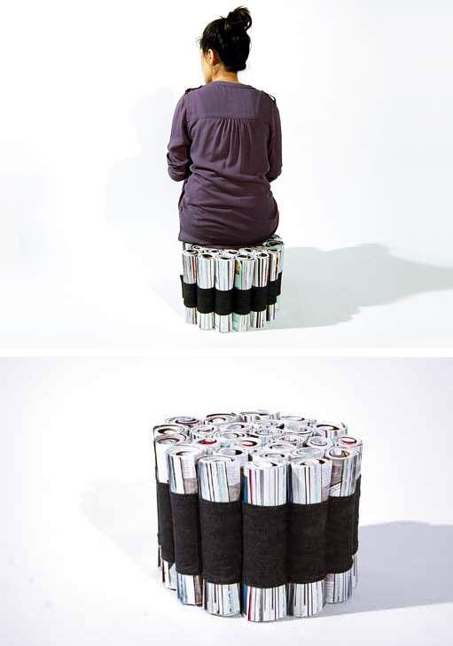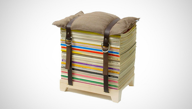 A ideia aqui é bastante simples. Se você precisa sentar sobre um monte de revistas, empilhe-as e pronto! Agora, para ter algo mais elaborado, podemos seguir a sugestão do estúdio de design alemão NJU Studio, que prende as publicações com dois cintos, dando firmeza ao conjunto. A almofada colocada como assento e a base de madeira transformam o que antes era uma gambiarra num verdadeiro móvel! O melhor dessa ideia é que as revistas não são danificadas e podem ser tiradas para leitura a qualquer momento.