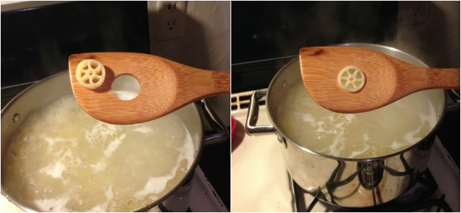 — E pra finalizar, fiquem com esse macarrão redondinho que cabe perfeitamente no buraco da colher de pau!