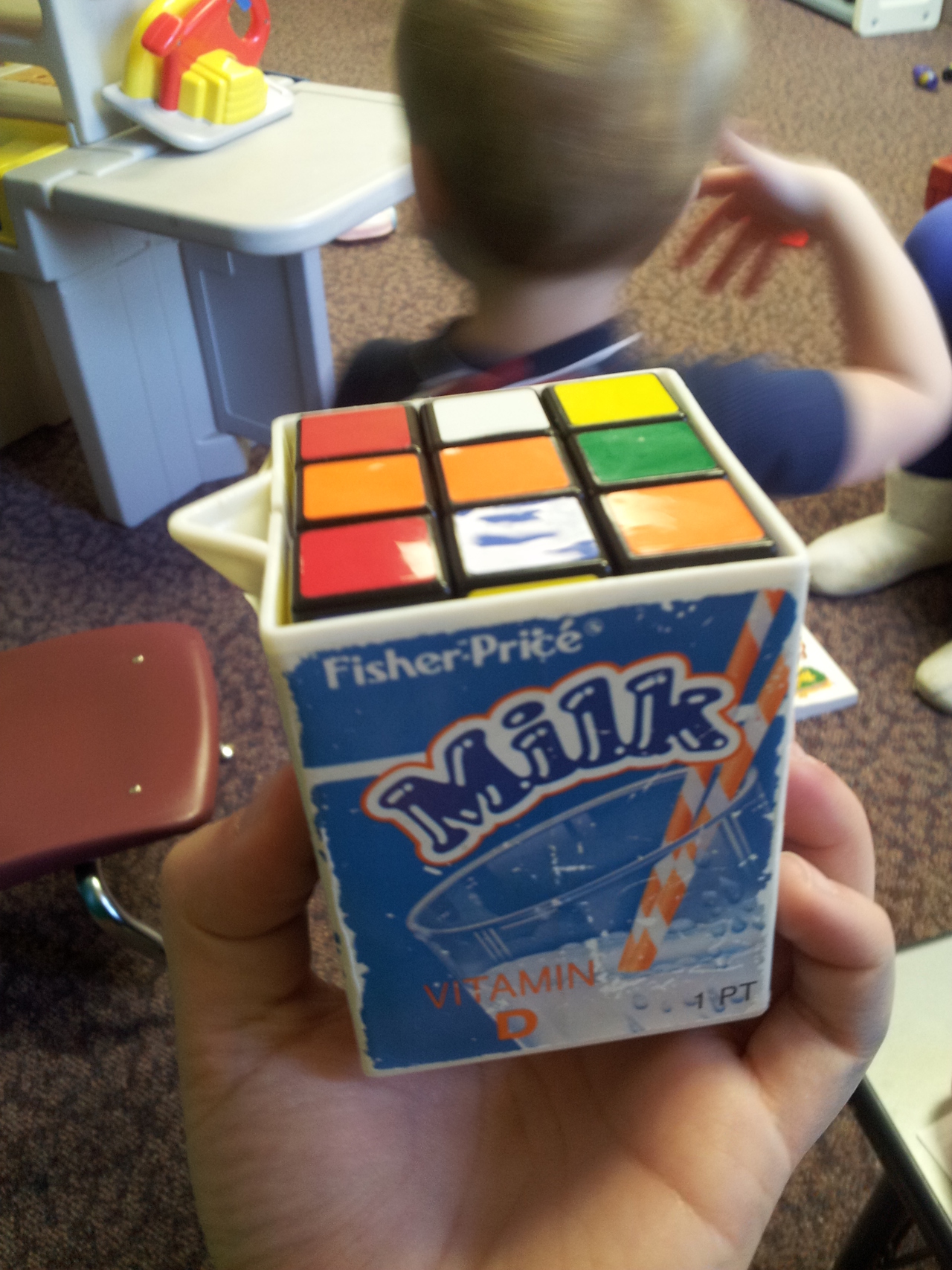 — O cubo mágico cabe certinho no copo de leite de brinquedo.