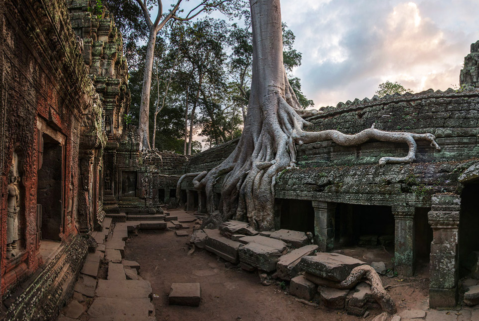 Sobre as centenárias ruínas de pedra do templo Ta Prohm, no Camboja, crescem inúmeras árvores. Podemos, inclusive, observar os troncos e raízes “escorrendo” até o solo.