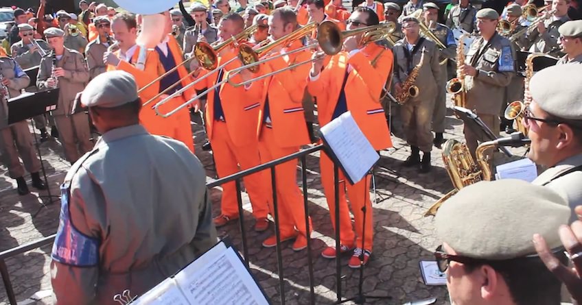 Peço licença para ser piegas, mas se os povos se visitassem – e se conhecessem – mais não haveria preconceito, guerras e qualquer outro tipo de esculhambação. O vídeo abaixo é um forte indício disso. As imagens registram o encontro entre a banda de fanfarra holandesa FACTOR 12 BRASS BAND, que veio para torcer pelo seu país no mundial, e Banda de Música da Brigada Militar.