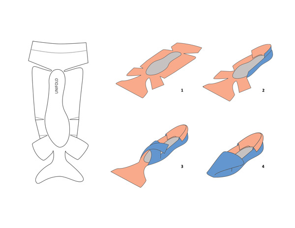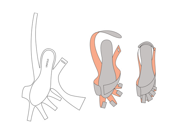 Essa é a criação do designer Horatio Yuxin Han, situado no Brooklyn, Nova York (EUA). Ele desenvolveu peças únicas, cortadas em EVA – um tipo de espuma com aspecto emborrachado, que quando dobradas se transformam em calçados.