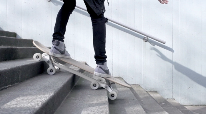 Com um sistema articulado, em que cada truck possui 4 rodas, duas de cada lado do eixo principal, o Stair-Rover é capaz de compensar a diferença de terrenos sem perder a estabilidade. Com o skate você pode, por exemplo, descer uma escada sem sofrer muito!