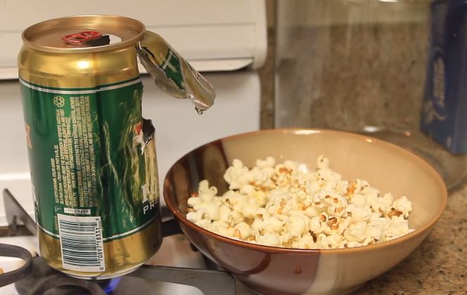 Se você estiver completamente desesperado para transformar milho em pipoca, mas não tiver utensílios disponíveis, o canal do Youtube CrazyRussianHacker ensina a fazer isso usando uma latinha de alumínio. O processo não parece ser 100% eficaz, mas funciona: