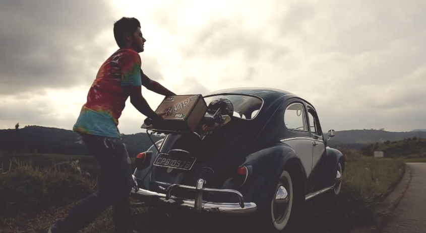 Ao dar o play nesse vídeo, a primeira coisa que me chamou a atenção foi esse belo Fusca preto acima, conservadíssimo. O carro é do pai de Gustavo Mello, o skatista praticante de downhill que aparece sacando os equipamentos do bagageiro para, na sequência, descer ladeira!
